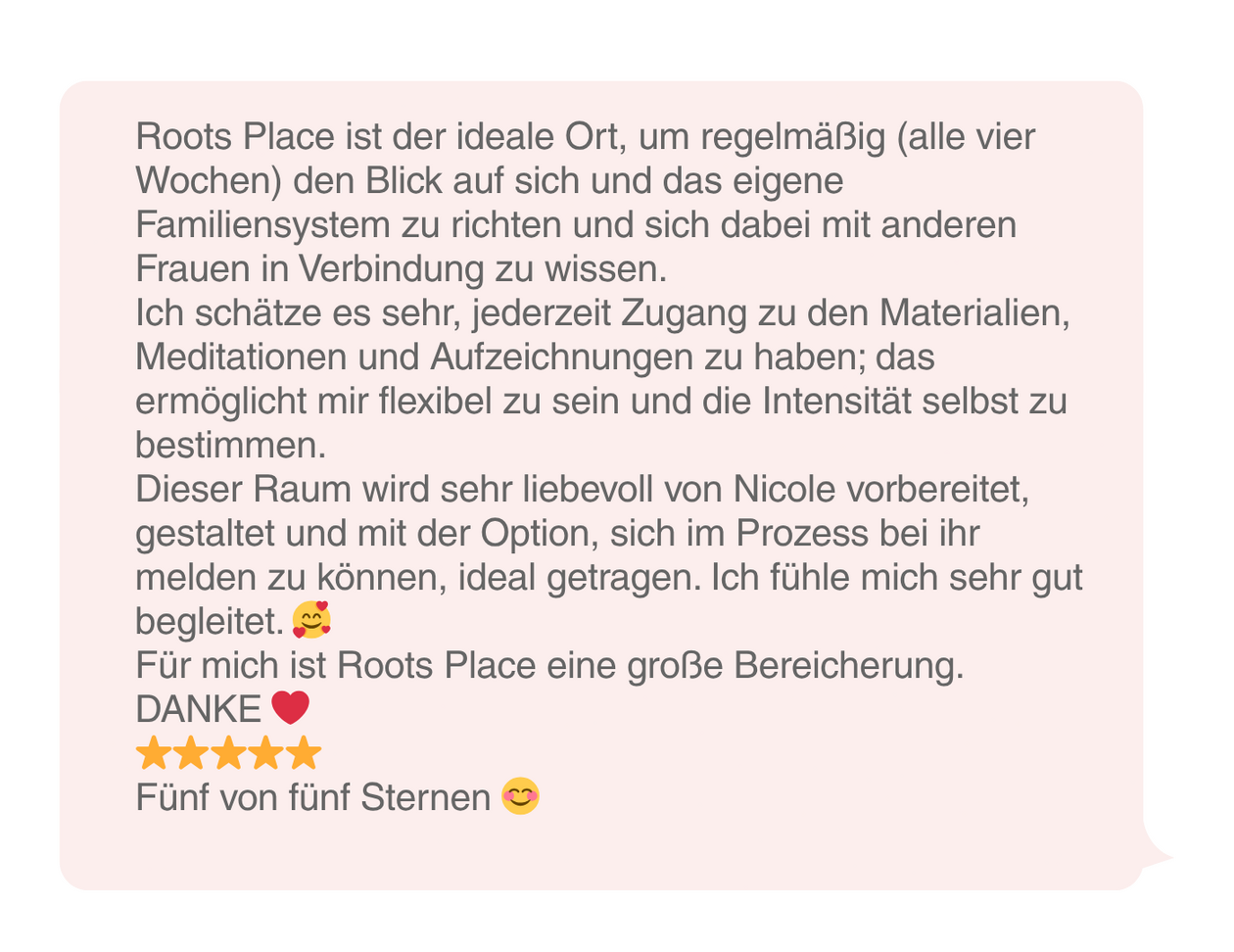 Und so entstand ROOTS – PLACE.ROOTS – PLACE ist ein herzlicher Raum, der dich willkommen heißt.Hier geht es nicht um oberflächliche Tools oder endlose Mindset-Übungen, sondern um echten Wandel. Du arbeitest fokussiert an deinen Wurzeln und an deinen emotionalen Mustern. Durch das Verständnis deines Familiensystems erkennst du deine Wurzeln, bringst sie in Frieden – und findest so einen klareren Platz in deinem Leben.