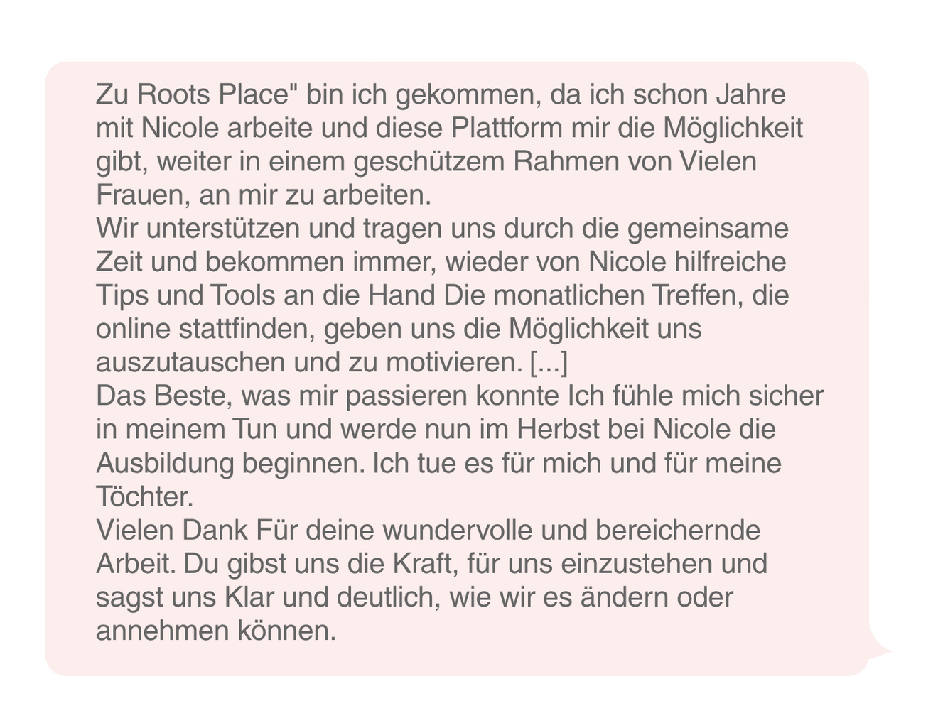 Für wen ist Roots Place nicht geeignet?Wenn du momentan keine Kraft hast, dich mit tiefgehenden Fragen auseinanderzusetzen oder ehrlich zu dir selbst zu sein, ist der Rootsplace vielleicht nicht der richtige Ort für dich. Dieser Raum ist für echte persönliche Entwicklung – das erfordert Mut, Offenheit und manchmal auch Geduld mit dir selbst. Rootsplace ist kein Ersatz für Therapie, medizinische oder psychologische Behandlung. Nicht geeignet bei akuter Krise, Traumatisierung oder Gewalt sowie wenn du 1:1-Therapie erwartest.